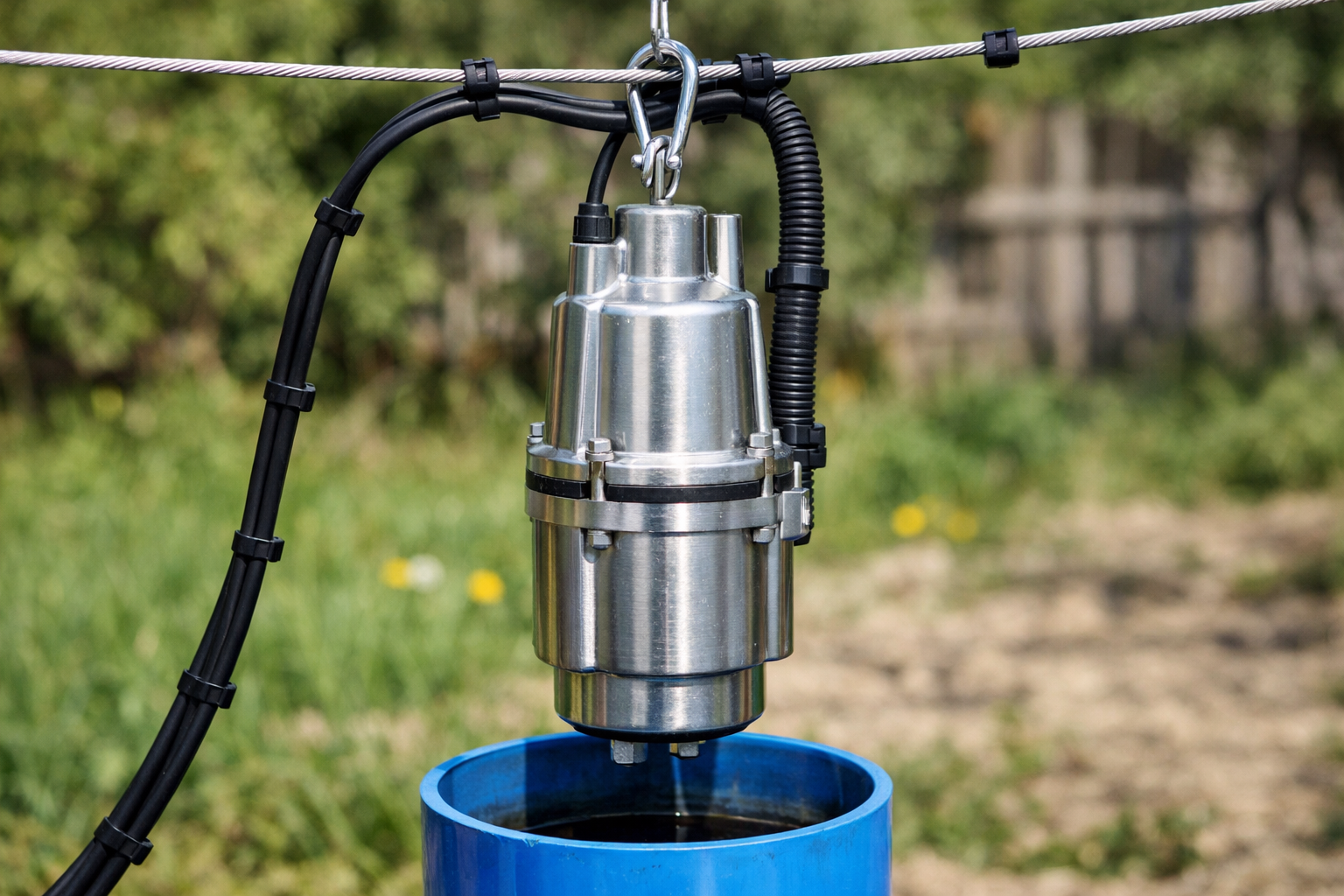Осмотрите трос. Используйте только стальной трос в ПВХ-оплетке или из нержавейки. Обычная веревка или капроновый шнур могут перетереться о стенки обсадной колонны. Доставать упавший насос с глубины 40 метров — дорогая и сложная лотерея.